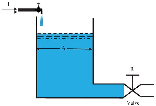 A tank system is displayed in Figure 5. Suppose is inflow disturbances of the tank that generates vibration in liquid level ϕ, also is the flow obstruction, which can be curbed utilizing the valve. is the cross section of the tank. The liquid level is illustrated as following relation [],