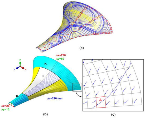 Figure 1b shows the PS directions of the blue principal stress trajectories on the bottom of the shell. In the middle plane and on the top of the shell there are other PS directions since membrane and bending stresses occur simultaneously. These directions stem from an eigenvalue problem of the stress tensor, whose eigenvectors (principal stress directions) remain indefinite in the sign. The PS directions can therefore switch the sign from one element to its neighboring element. The integration pattern in Figure 1c takes this problematic situation into account by replacing the direction vector with a bidirectional element. The bidirectional element intersects two opposing element sides and thereby allows the integration to be continued in the two neighboring elements with their directional elements. Each start element (marked in red) in Figure 1a provides two individual fiber courses with the procedure just described, corresponding to the two PS directions. A regular placement of the start elements in no way guarantees a uniform distribution of the PS lines. A homogenization of the fiber courses is achieved only with considerable effort. A further disadvantage of this procedure is immediately apparent; each individual trajectory (fiber) must be calculated separately. Should the designer change the fiber volume ratio for reasons of strength, then the procedure must be repeated from the beginning.