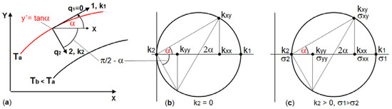 Orthotropic (principal) thermal conductivities k1 and k2 being oriented according to the direction field of Equation (1) should be transformed into the Cartesian system. The transformation equations for the 2D heat conduction tensor are analogous to a 2D stress tensor, and can be illustrated using trigonometric relationships with Mohr’s (Stress) Circle, as shown in Figure 2.