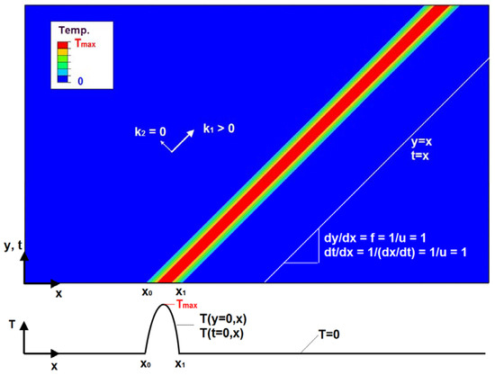 with time t and the convection velocity u = dx/dt. The variable T represents temperature here; it could also stand for mass, momentum, or energy. In order to demonstrate the particular properties of Fourier heat conduction (k2 = 0) in a simple example, f = y’ = 1 is substituted in Equation (11) and u = 1 in Equation (15). Therefore, both equations are formally identical. The location variable y in Equation (11) corresponds to the time variable t in Equation (15), y and t are interchangeable. By simple integration of Equation (13), dy/dx = f = 1, the isotherms are represented by the straight lines y = x + C. Figure 3 shows the corresponding solution for Equations (11) and (15), which was obtained with the FE program ABAQUS (Dassault Systèmes, Vélizy-Villacoublay, France).