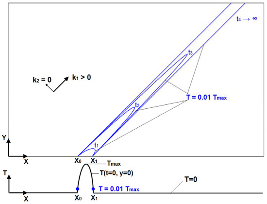The initial condition for T(t = 0, x0 ≤ x ≤ x1) and T(y = 0, x0 ≤ x ≤ x1) is given by a parabolic temperature distribution. The orientation of k1 is given by the vector (1, 1) in the entire solution area. Extreme orthotropy is achieved by zero-setting of k2 whereby k2 is perpendicular to k1.