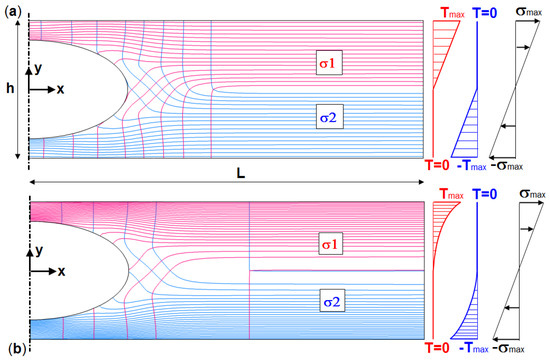 The two-node temperature boundary condition is likewise possible. For example, to determine the σ1 trajectories, specification of T(L,h/2) = Tmax and T(L,0) = 0 provides similar results, though the isotherms are not distributed equidistantly on the right boundary; see also Section 3.1.