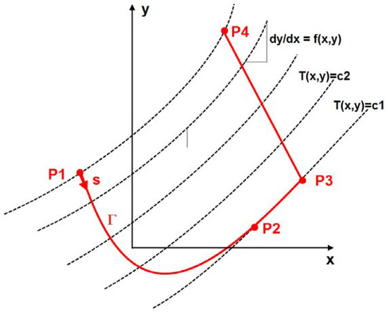 and is discussed in detail in the literature [12,13,14]. The required function T(x,y) depicts a surface in three-dimensional space. The theory of the “characteristic method” [12,13,14] for solving Equation (12) implies that its characteristics are the contour lines of T(x,y) and can be calculated with the ordinary differential equation: