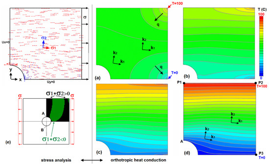 Perforated disc under axial tension and calculation of the PS lines (isotherms) dependent on heat conduction orthotropy k1/k2, where the orientation of k1 and k2 corresponds to the PS directions σ1 and σ2: (a) k1/k2 = 1; (b) k1/k2 = 16; (c) k1/k2 = 128; (d) k1/k2 = 4096; (e) algebraic signs of the two principal stresses; this point is addressed in Section 3.4.
