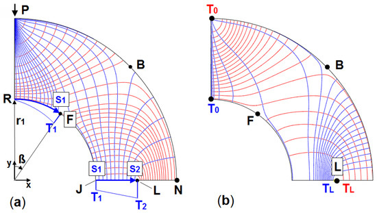 The existence of a singular point on a load-free boundary of a 2D structure always results in this change of trajectories. This property is responsible for the fact that efforts need to be made regarding the specification of suitable temperature boundary conditions in order to obtain uniformly distributed isotherms. Should the temperature be defined only along RF, then only a part of the structure will show isotherms. A further boundary segment with temperature boundary conditions must then be applied in order to capture the rest of the structure. In Figure 9a, this is segment JL. The procedure is the same when looking for σ1 trajectories. The temperature is defined as linearly increasing along PB with continuation along LN.