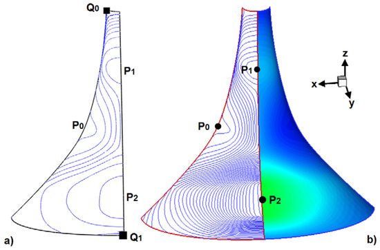 Shell structure analogous to Figure 1: (a) Isotherms with a two-node temperature boundary condition at Q0 and Q1; (b) Isotherms with a three-node temperature boundary condition at P0, P1, P2, right: Temperature field for extraction of any number of isotherms (fibers).
