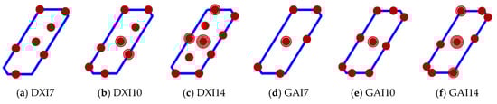The boundary is formed by six vertices. The full model under consideration is the quadratic mixture model. Weighted IV optimal designs with = 7, 10, and 14 points were generated by the GA using a relative weighting factor = 100. These designs are labeled GA7, GA10, and GA14, respectively. The set of possible reduced models are those in Table 1. We choose = 25 designs to comprise the GA population of chromosomes. In a preliminary study, we investigated the choice of GA parameter values and the number of generations to observe convergence when running the GA. Based on these results, the number of generations was set to 6000, and the ranges of genetic parameter values were , where , and represent the success probabilities of blending, between-parent crossover, within-parent crossover, and mutation, respectively. Initially, the parameter values are set to the largest level, and after every 1500 generations, these parameter values are systematically reset to smaller values. The optimal choice operators and the GA parameters across operators is an open research area.