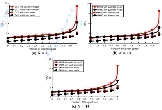 The final comparison uses fraction-of-design-space (FDS) plots to examine model robustness. A model-robust design should perform consistently well with respect to the scaled predictions in the design region for all possible reduced models. The vertical axis represents possible scaled prediction variance values (Equation (5)) and the horizontal axis represents the fraction of the mixture design space that has scaled prediction variance values less than or equal to . Thus, a FDS plot is equivalent to a cumulative distribution function plot but with the axes reversed. For additional information of the FDS plots for examining model robustness, see Ozol-Godfrey et al. [].