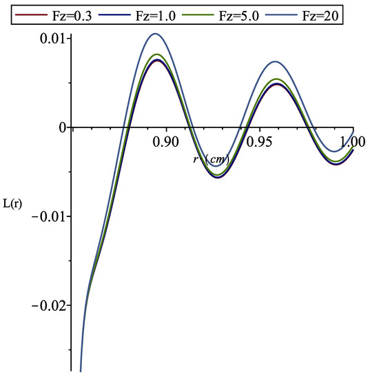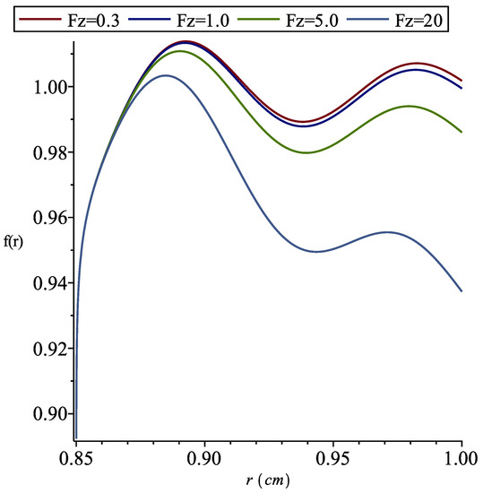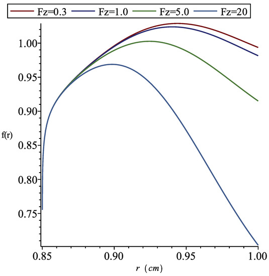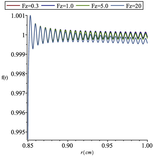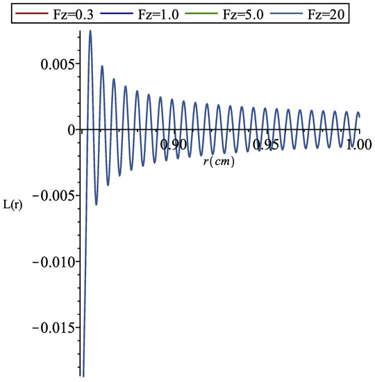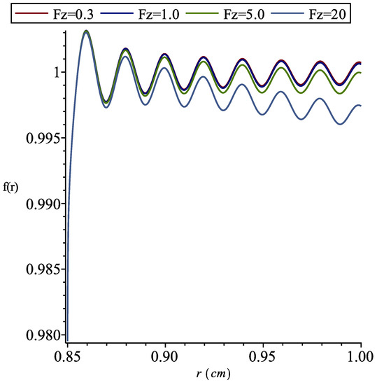 where , are Bessel functions of the first kind ,, are Bessel functions of the second kind and is a Struve function. and are constants taken to by each equal to unity. It is evident that the solution given by Equation (33) with through as in Equations (34)–(37) is positive everywhere with the exception at of being exactly zero. The convergence to zero is quite slow as The dynamic viscosity of fluid 2 which we take to be for water as a test case is dyn. s/cm at a temperature of 25 degrees Celsius and at the same temperature the density of liquid water is gm/cm. Next we transform the center of the tube to the interface as in Figure 1. Mapping r into in Equation (33), where is the radial value at the gas/water interface, it can be shown that at . We choose , and let r run to . Results for the transformed function are shown in Figure 2, Figure 3, Figure 4, Figure 5 and Figure 6. In Figure 7 and Figure 8 results are shown for composite velocity which is in the r direction, i.e., , see Figure 1. Finally we approach a hyperbolic tan function as becomes very large and negative for . This is due to the fact that can be analytically continued to the interval closest to and to the left of . It is evident that if we set to be the standard distance function from the interface [5,6] we can solve numerically for d in Equations (33)–(37) and verify that d is oscillating hence implying that the interface is oscillating back and forth in the radial direction. In addition I have compared to [16] for verification of a tan hyperbolic representation near the interface which is used there in a numerical approach. The solution given by Equation (33) can also be written in the form , where is chosen to be large and negative (not equal to ). It was verified that could be shifted by scalar addition to avoid a velocity that is undefined at zero as in Equation (18). The governing equations were extended by multiplying by the result of added to a nonzero constant. This results in a finite integral for over the tube radius and meaningful comparisons to velocity measurements can be made as found in the literature [17], we have,