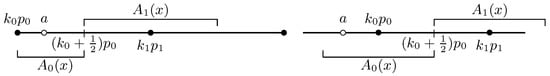 Now, we consider the case (or even ); then, we choose on because as shown above for . Next, we consider the case when . We extend the approximation process to determine the next integer by setting (k0 +1 )p0, and also (k0 + 1)p0, (k0 +1 )p0. Because , by the choice of , we must have . Note that, from (36), we also have . If , we then have cases that are illustrated in Figure 3. It is obvious that we can set on , regardless of or . However, we will take different settings on the other intervals, depending on where b is from . These settings can be given in the following: