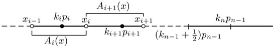 Finally, continuing the above process, we obtain a finite sequence , , …, such that (ki−1 + 1)pi−1, , and . Then, we also gain two sequences (ki−1 + 1)pi−1 and (ki−1 + 1)pi−1, . Before giving our settings for this general case, let us consider ending points of the approximate intervals by taking two consecutive nodes , . If we let , then we have , so that
