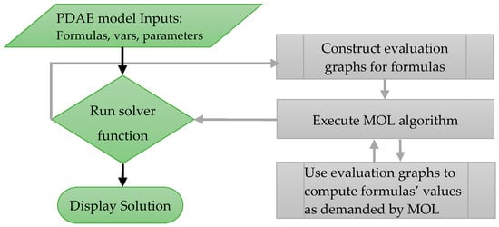 To the best of our knowledge, no prior work has demonstrated a practical spreadsheet method for dynamical optimization of a general nonlinear PDAE with discontinued properties. To enable the devised method of this paper, we rely on an unconventional approach for exploiting the spreadsheet computational engine [15,16,17], which permits us to encapsulate the MOL in a mathematically pure spreadsheet function suitable for natural integration with the Excel NLP solver. The PDAE solver function, named PDASOLVE, behaves just like any built-in math function, and operates according to the flowchart logic of Figure 1, with a clear divide between model input, MOL procedure, and output solution. Unlike traditional methods, PDASOLVE does not modify its input, which permits employing it in a functional dynamical optimization paradigm. In this paradigm, the authority to modify the parameters of the PDAE system is confined to the outer NLP solver, whereas the inner PDASOLVE function is simply evaluated repeatedly as directed by the NLP algorithm. Moreover, decoupling the MOL procedure from the spreadsheet grid facilitates supporting more general PDAE models with discontinuous properties as demonstrated in Section 4.