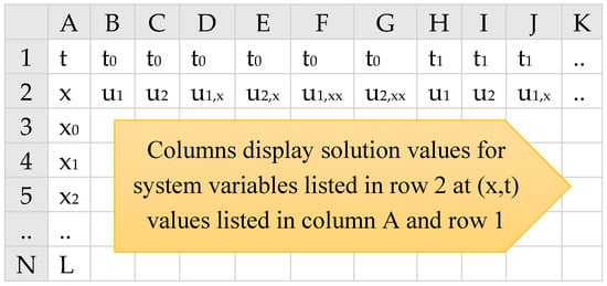 Formula (8) is evaluated in the spreadsheet as a standard array formula in an allocated array of sufficient size to hold the solution result. The layout of the solution can be either a transient or snapshot format. In the snapshot format, shown in Figure 2, the spatial output points are listed in the first column of the array, whereas the temporal output points are listed in the first row of the array, and the solution state variables, (including derivatives if requested) are listed in repeated blocks of columns. This format is convenient for plotting a spatial-distribution (snapshot) view of the solution at different time points. In the transient layout, the order of x and t is swapped to allow for direct plotting of the variables’ transient trajectories at selected spatial points. Switching between the two formats is controlled via optional parameters [22]. By default, the solution is reported at uniform intervals for time and space, determined by the allocated size of the output array. However, via optional parameters, the output solution can be customized in multiple ways, for example, by specifying the exact time or space output points, by specifying the size of the division for time or space, and by requesting to report the first and second derivatives of the state variables. Some of these options are utilized in the examples of next section.