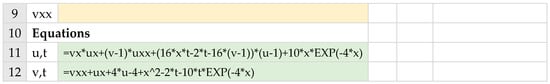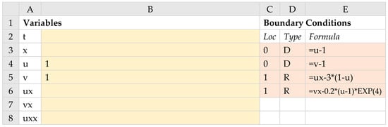 It is convenient to define and work with named cell variables rather than work with raw cell addresses, such as A1. Referring to Figure 3, we started by naming cells B2:B9, respectively, as t, x, u, v, ux, vx, uxx, and vxx to serve as the system variables. Variables u and v are assigned the initial conditions values of one which, in general, can be formulas of the spatial variable x. Using the named variables, the equivalent formulas for the system right-hand-side Equations (9) and (10) were defined in cells B11:B12, and the left (x = 0) and right (x = 1) boundary conditions were defined in the matrix C3:E6. Note that each boundary condition is represented by an equivalent formula with respect to zero on one side, and assigned the appropriate type. In this example, we have Dirichlet at x = 0 and Robin at x = 1.