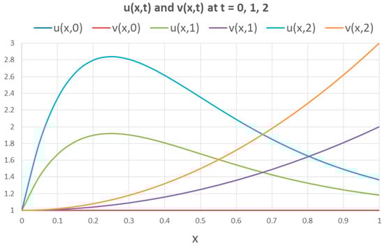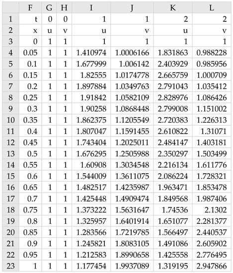 Evaluating Formula (13) as an array formula by pressing Ctrl+Shift+Enter simultaneously populated the allocated array F1:L23 by the formatted solution shown in Figure 4 under one second of computing time (the measured CPU clock time was 0.852 s). Snapshots of u and v profiles at different times are plotted in Figure 5.
