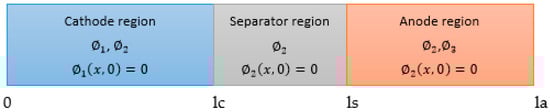 We considered a parameterized PDAE system of Equations (14)–(16), constructed to model a hypothetical battery with three regions as shown in Figure 6.