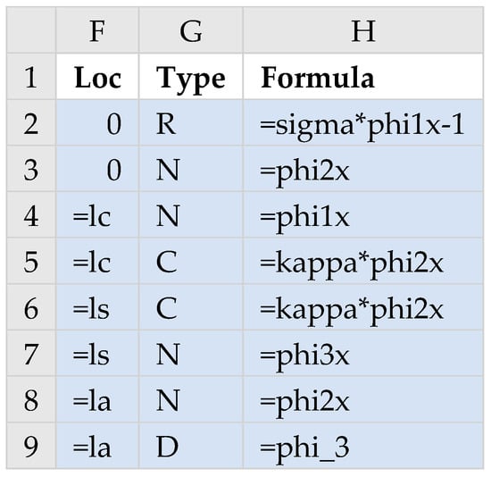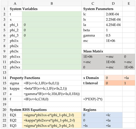 Modeling System (14)–(16) in the spreadsheet by equivalent formulas and variables is straightforward with a few ordered steps. Referring to Figure 8, we named cells B2:B12 as t, x, phi_1, phi_2, phi_3, phi1x, phi2x, phi3x, phi1xx, phi2xx, phi3xx to represent, respectively, the system’s variables . We then defined the initial conditions for phi_1, phi_2, and phi_3, which are simply zero, but in general, may be formulas of the variable x. Likewise, we named cells D2:D7 as lc, ls, la, beta, gamma, and mc to represent, respectively, and , and assigned their numerical values given in Table 3. We defined the mass matrix M as shown in range C10:E12 and chose to parameterize the off-diagonal term with mc rather than store its numerical value, since we intend to use it as a design variable in the ensuing optimization exercises. Using the standard IF statement, we defined the property and source functions , ,, and as shown in cells B15:B18, as well as assigned them the names sigma, kappa, a, and f, respectively. Using the named variables, we defined the system (14)–(16) right-hand-side equations by the equivalent formulas shown in cells B21:B23. Next to each equation, we defined the corresponding spatial region as shown in C21:D23. The spatial domain and time interval are defined in ranges D14:E14, and D15:E15, respectively.