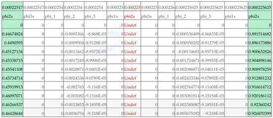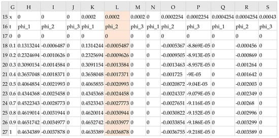 Evaluating array Formula (23) requires a larger array size to hold the additional output derivatives. The minimum number of columns can be determined by evaluating Formula (23) in one cell initially, which reports an error message with the required minimum array size for output. In this case, it is 49 columns. Figure 13 displays a portion of the formatted output solution around , which shows the values of phi2x just before and after x = 0.000225 (ls). A quick inspection of the values shows that the ratio is satisfied. The computed ratios at and for all time points are shown in Table 6. With the increased grid size, the measured CPU time was 1.445 s for this run.