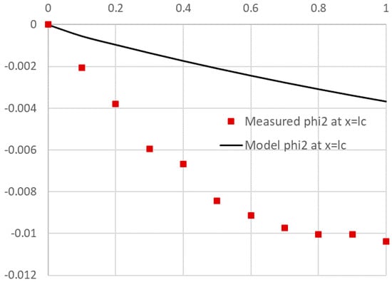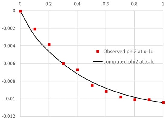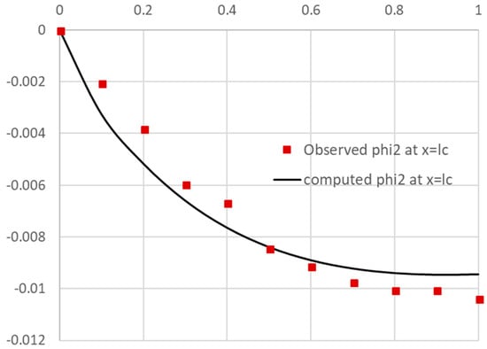 PDASOLVE Formula (22) is run as a standard array formula in a preallocated range of sufficient size to hold the solution result. By default, it reports values for the state variables at uniform intervals for time and space determined by the size of the allocated solution array. In the first run, we evaluated array Formula (22) in the selected range G15:S27 (by pressing Ctrl+Shift+Enter), and obtained, almost instantaneously (the measured CPU time was 0.477 s), the solution shown in Figure 10. The output range size was selected such as to report the solution only at the geometrical points of the spatial domain (regions ends) with 10 divisions of the time interval. The computed values for phi_2 at x = lc are highlighted in the figure and plotted in Figure 11, along with the observed values which exhibits unacceptable divergence. However, prior to optimizing the model, we demonstrate next how to verify the numerical solution accuracy and, in particular, verifying that the flux continuity conditions are satisfied.