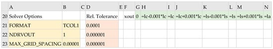 The default solution result as obtained in Figure 10 is insufficient to verify that the flux continuity conditions , and are satisfied at and . Therefore, we illustrate use of additional optional parameters to PDASOLVE in order to: first, report the first derivatives at custom spatial points just before and after and , and, second, enhance the solution accuracy. Figure 12 shows the definition of new optional parameters consisting of: the custom output points defined in G20:N20, which is named as xOut; the relative tolerance vector for the three state variables defined in D21:D23, which is named as rTols; and a set of key/value pairs defined in A21:B23, which is named Cntrls. The keys include NDRVOUT with a value of 1, which instructs the solver to report the first derivative variables in the output, and MAX_GRID_SPACING, which ensures that the maximum distance between computational spatial grid nodes does not exceed the specified value of 1.0 × 10−5. The initial PDASOLVE Formula (22) has been modified as shown in Formula (23), in which we pass the new optional parameters as defined in Figure 12.