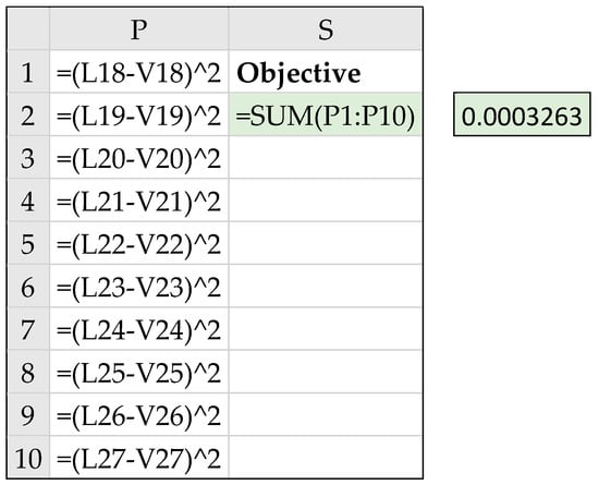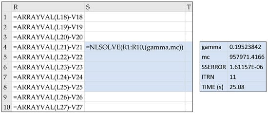 We evaluated NLSOLVE Formula (28) in array S4:T8 as shown in Figure 21. It converged in about 25 s and displayed the results shown on the right of the Figure 21. The computed LM solution took less time and was slightly better, with a lower objective value of 1.611 × 10−6 from that obtained with Excel GRG solver. Since NLSOLVE is a pure spreadsheet function, it does not modify its arguments or update the spreadsheet calculation. Therefore, to update the PDASOLVE result, the computed numeric values for gamma and mc must be copied manually to their respective variable cells D6 and D7 of Figure 8.