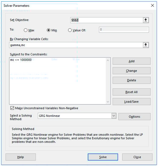 Figure 15. Excel Nonlinear Programming (NLP) solver dialog configured for problem (24).