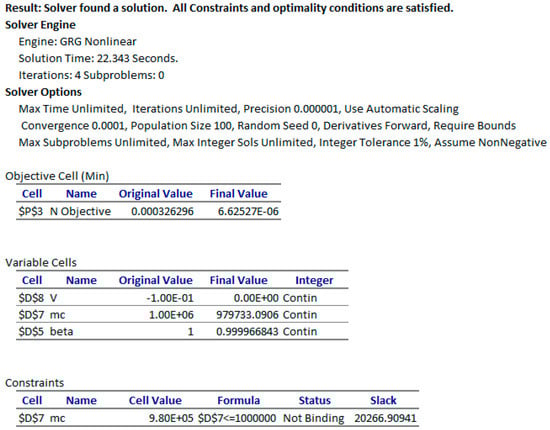 We configured the NLP solver to vary the design variables V, mc, and beta. The Solver converges essentially to the same result obtained in the last experiment at nearly the same cost by finding V at 0 and near 1 as shown in the Answer Report of Figure 20.
