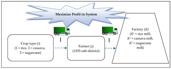 We designed and developed a mathematical model to maximize the profits for the farmers. The related factors considered were crop price, cost of each crop’s cultivation, yield rate of each crop, planning area in each district, transportation distance from planning area to factory, cost of each crop’s transportation, amount of each crop’s transportation, and cost of cultivation, which are expressed as follows: