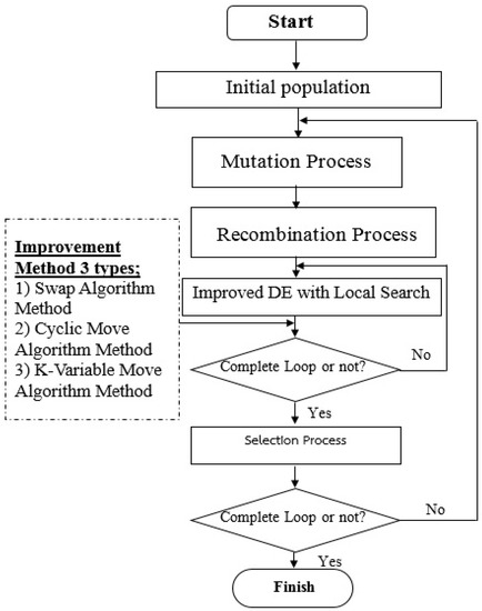 This section outlines developing and improving algorithms with DE and using Dev-C++ for testing three different-sized problems. DE is used with local search to develop the algorithm by adding a specific search step after the value exchange process in the recombination. The algorithms are developed to provide better results. There were three methods: (1) the swap algorithm, adapted from the method of Diaz and Fernandez [66]; (2) the cyclic move algorithm; and (3) the K-variable move algorithm. Figure 2 illustrates how these methods improved the steps of DE. The DE that is used in this article is conventionally called DE/rand/1/bin.