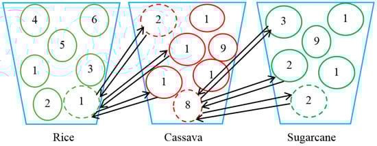 - Calculate the probability of assigning the plants to the fields. Using the proposed algorithm, we applied the price of the plants to calculate this. The probabilities of assigning rice, sugarcane, and cassava were 0.32, 0.39, and 0.29, respectively, for the current example.
