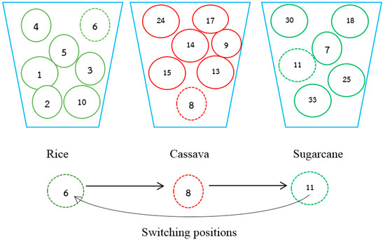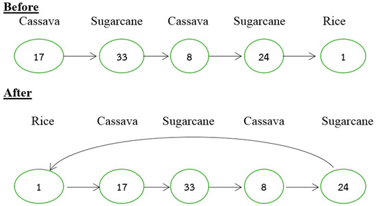 This method selects one farmer from each group then switches each farmer in a circle. Farmer 6, who is originally assigned to plant rice, for example, is changed to cassava. Next, Farmer 8, who plants cassava, is changed to sugarcane. Additionally, Farmer 11, who plants sugarcane, is changed to rice, relocating all the positions using the same method by randomizing all rounds. Once again, the switched pairs increase the profit, as seen in Figure 4.