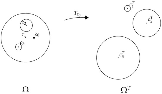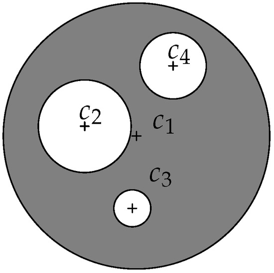 Provided that is interior to , the map of by noted , as illustrated in Figure 2, is the unbounded region exterior to a set of non-overlapping circles of center and of radii defined by