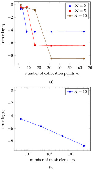 In Figure 5a, the logarithm of the distance between both solutions is presented. As the number of terms used in the Laurent series increases, the difference decreases for high numbers of collocation points. As discussed previously, the error converges for values of greater than . As such, as the number of terms N in the Laurent expansion increases, the error converges for larger numbers of collocation points, but converges towards a lower value.