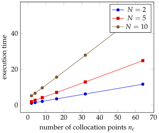 In this section, we consider the execution time to compute the approximation of the Green’s function at one point, noted as g in Section 2.2. We normalize the resulting times relative to the execution time in the test case where and . The results are presented in Figure 6 for different values of N and of .