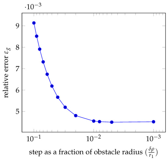 where the norm is computed on by discretizing the domain along a Cartesian grid as was done for Equation (40). This error, which is expected to approach 0 for small values of , is given in Figure 9 for perturbations of decreasing amplitudes, for a dilation of the radius of the inner disc.