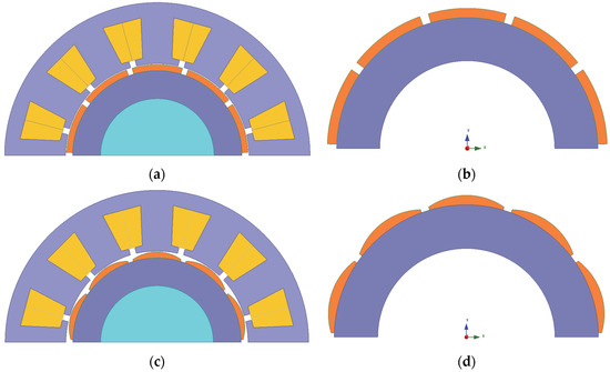 The cross-sections of the studied motor. (a) with the uniform rotor; (b) uniform rotor, (c) with the optimal rotor, (d) optimal rotor.