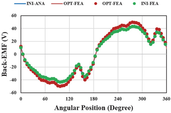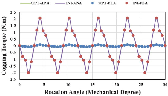 The 2D finite element method is applied to the performance calculation of the motor with uniform and non-uniform rotor shapes. The magnetic field distribution in the studied motors is represented in Figure 5. Open circuit analytical and numerical comparisons of the cogging torque for both motors with initial and optimal magnet shapes are shown in Figure 6. The on-load comparison of the back electromotive force of the investigate motors with the initial and optimal magnet shapes is carried out analytically and numerically as shown in Figure 7. An analytical and numerical comparison of the radial flux density for the 12S-10P motor in an open circuit and on-load condition is shown in Figure 8. An analytical and numerical comparison of tangential flux density for the 12S-10P motor in open circuit and on-load condition is shown in Figure 9. An on-load comparison of the electromagnetic torque of the 12S-10P motor with the initial and optimal magnet shapes is shown in Figure 10.