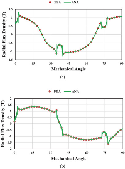 An analytical and numerical comparison of radial flux density for the 12S-10P motor. (a) Open circuit condition; (b) On-load condition.
