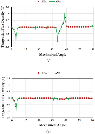 An analytical and numerical comparison of the tangential flux density for the 12S-10P motor. (a) Open circuit condition; (b) On-load condition.
