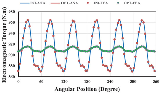 A variety of techniques including analytical and numerical methods have been conducted to evaluate the pulsating torque components in electrical machines. Numerical methods like the finite element method (FEA) give accurate results and are time-consuming especially in the first step of the design stage. Semi-analytical methods including conformal mapping [11,12,13,14] and Magnetic Equivalent Circuit (MEC) [15,16,17], and analytical methods including the subdomain model [18,19,20,21,22,23,24,25,26,27,28,29,30,31,32,33] are reported to model electrical machines and are useful in the design optimization stage. The subdomain model is more accurate than the other analytical models [15].