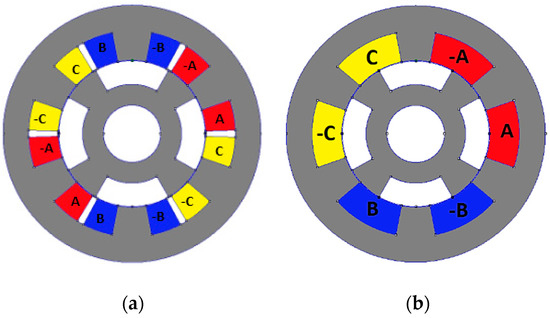 where is the vector of phase currents whose currents’ waveform is sinusoidal with a phase shift of electric, is the surface of the stator slot coil, and & are the transpose of the connection matrix between the three phases and the stator slots that represent the distribution of stator windings in the slots of the M1 with all teeth wound (double-layer winding with left and right layer) (see Figure 1a) is given by [33]: