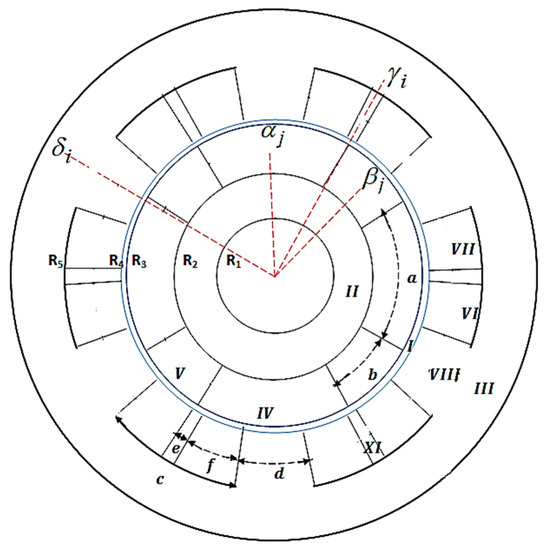 - j-th Rotor slot and j-th rotor tooth subdomain (Region IV and V): The solution of (1) in Region IV, & , is defined by:where and are respectively the position and opening width of j-th rotor slot, are the integration constants of Region IV, and are respectively the periodicity of in θ-and r-edges.