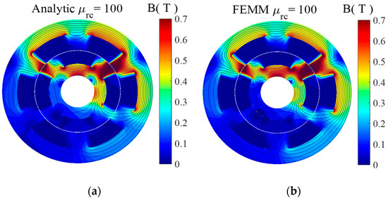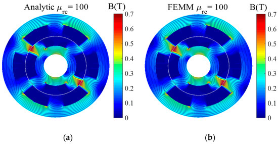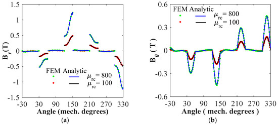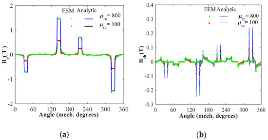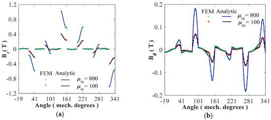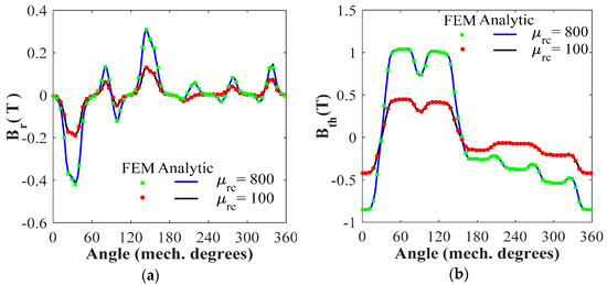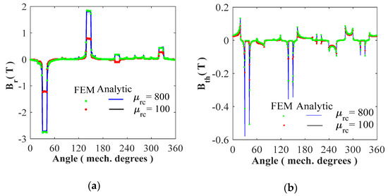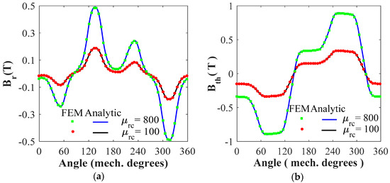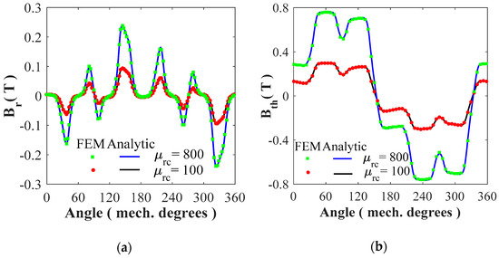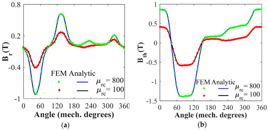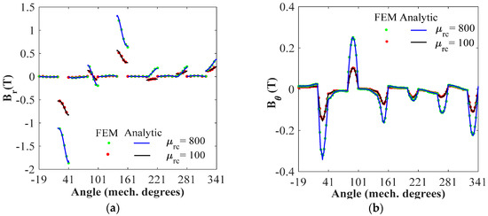 The waveforms of r- and θ-components of the magnetic flux density in the various regions are computed with a finite number of harmonic terms, viz., and . The analytic calculation of magnetic flux density distribution in all regions is done considering the same relative permeability in all iron parts (i.e., stator/rotor yoke and teeth). The soft magnetic material permeability is constant corresponding to the linear zone of the B(H) curve. However, it is possible to use a different relative permeability value for each region [28,33,36].