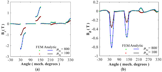 In Figure 4 and Figure 5, a comparison between the numerical results and semi-analytical predictions is shown the r- and θ-components of B in the air gap middle (i.e., Region I at ) for two studied SRMs (i.e., M1 and M2). The simulations are done for two different values of iron core relative permeability (viz., 100 and 800). It can be seen an asymmetric distribution in the r- and θ-component of the air gap magnetic flux density in M2 in contrary to M1, this is due to the diametrically asymmetric disposition of slots and phase windings as shown in Figure 1b.