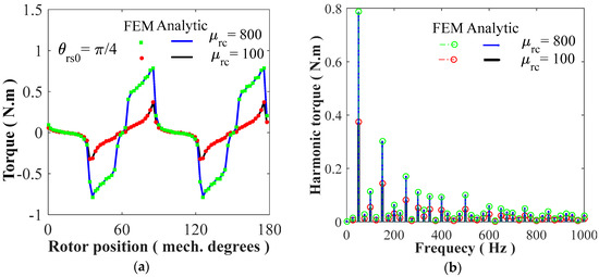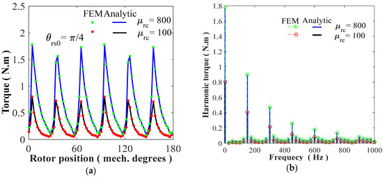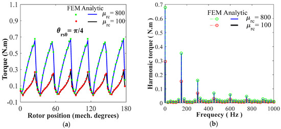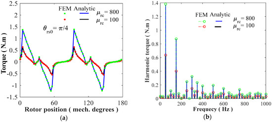 For two studied SRMs (i.e., M1 and M2) and for both values of iron core relative permeability, Figure 16, Figure 17, Figure 18 and Figure 19 show the waveform as well as the harmonic spectrum of the static/dynamic electromagnetic torques for full-load condition (viz., 15 A @ 1500 rpm). The static electromagnetic torque represents the torque due to a single phase of the electrical machine (e.g., due to phase A). The dynamic electromagnetic torque represents the torque when the three phases are powered or due to the combination of three static electromagnetic torques. The good agreement between the results from 2D FEM and the proposed semi-analytical model can be seen. It is interesting to note that the ripple torques are more important for M2 (see Figure 19) with the same operating point.