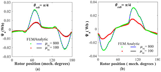 For full-load condition (viz., 15 A @ 1500 rpm), the induced magnetic flux linkage per phase of two studied SRMs (i.e., M1 and M2) are given in Figure 20. The simulations were done for both values of iron core relative permeability.