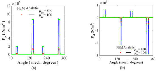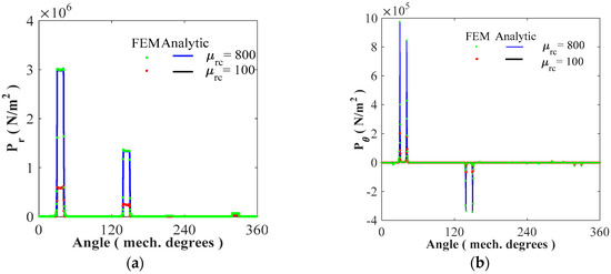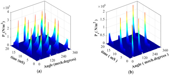Waveform of magnetic pressures (for no-load condition) in M1: (a) r- and (b) θ-component.