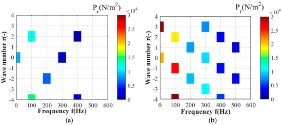 The obtained results confirm the previous interpretation of the UMF. The component of the mode shapes one correspond to the wave number (i.e., ) of the UMF does not appear in M1 due to the symmetric distribution of the air gap magnetic field with respect to the space angle p, contrary to M2. The component corresponds to the wave number (i.e., ) is appeared in both SRMs, because of the asymmetric distribution magnetic field in the air gap with respect to the space angle , as seen in Figure 4 and Figure 5. Moreover, it can be seen that the other modes that appeared in the two SRMs are multiples of the least non-null wave number in M2 and in M1.