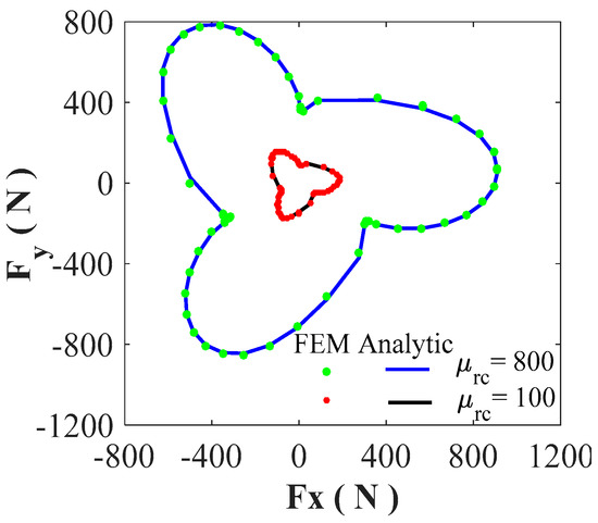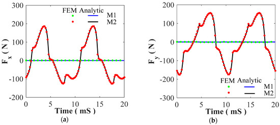 Figure 23 and Figure 24 show the r- and θ-components of P in function of space angle for the two studied SRMs (i.e., M1 and M2) and both values of iron core relative permeability. The analytical radial magnetic pressure in function of temporal rotor angle and the spatial angle is represented in Figure 25 for a no-load condition. Figure 26 shows the fast Fourier transform in 2D (FFT2D) of analytical radial magnetic pressure for M1 and M2. The x- and y-components of F in M1 and M2, for a no-load condition, are shown in Figure 27. It is clear that the non-intrinsic UMFs can be significant in SRMs, having diametrically asymmetric disposition of non-overlapping winding and due to the asymmetric magnetic field distribution in the air gap (see Figure 5).