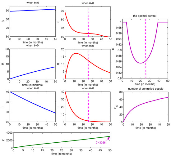 Figure 1 depicts the dynamics in the absence and presence of the control and we can see that the number of susceptible people has increased linearly from its initial condition to a number higher than 92.5 individuals when we choose , while the optimal state increases during the first months of the optimal control strategy and it decreases when we work with the characterization of Equation (11). Simultaneously, the number of removed people increases to only a value close to eight people while it reaches a value higher than this number with a maximal peak equaling to 17 when . As regards to the number of infected people, it decreases from its initial condition to a value close to an important value of 30 individuals because of the natural death and recovery only, while it decreases towards a value very close to zero after the introduction of the control . We can see the relationship between the number of controlled people and the optimal values taken by so when this is increasing, the optimal state is also increasing. In fact, we can deduce that, with only small values of , we reach our goal by minimizing I function, and maximizing R function while the total number of the susceptible who received the control along T and which is represented by the function Z has not exceeded the imposed constant C. The dashed lines introduced in this figure show the highest fixed point value of the sought final time, and we can understand that, at this point, we have already reached our goal which concerns the minimization of the number of infected people and maximization of the number of removed people. The next figure gives more information about the obtained value of .